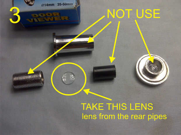 Para superar este problema, tengo esta idea de utilizar la lente de un "espectador de la puerta" con un diámetro de 14mm y 35-50mm de longitud.
