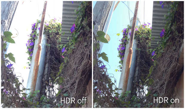 Compruebe la foto arriba para obtener una mejor idea de lo que hace - la foto de la izquierda fue sacada con HDR. El cielo está totalmente quemado hacia fuera y los colores son lavados fuera total. También es muy brillante, la pared a la derecha! A la derecha, HDR está encendido y la saturación es mejor para el cielo, muro y flores. Con la edición un poco esta foto se verá mucho mejor que el informe original de la versión.