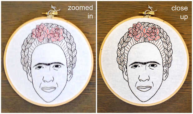 Revisa la foto de arriba para un buen ejemplo. Puse un bordado en el piso y tomó la primera foto sosteniendo la cámara a la altura del pecho y zoom. La segunda foto tomó justo sobre el bordado. Ver qué tan claro es la segunda foto y cómo inestable la primera es! Es una gran diferencia.