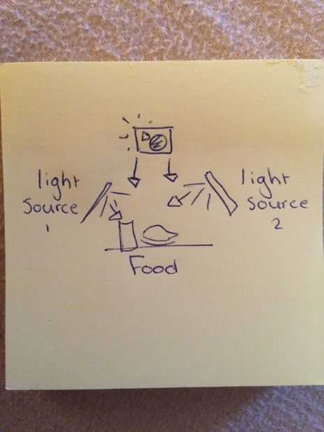 Si necesita iluminar su alimento utilizando luz artificial probar y tomar la fotografía de arriba o use iluminación a ambos lados del plato para eliminar sombras.