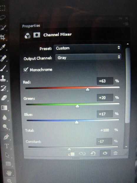 Cuando la ventana se abre, marcar la opción monocromo. Luego mover las escalas de rojas, verdes, azul a la izquierda y derecha, moverlo hasta que usted se siente satisfecho con su imagen. Tenga en cuenta, en la parte inferior de esa ventana, que dice 'Total' que debe ser siempre igual a 100, no más no menos.