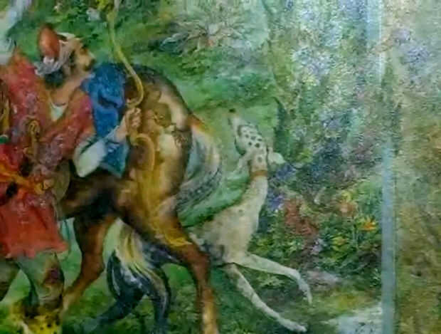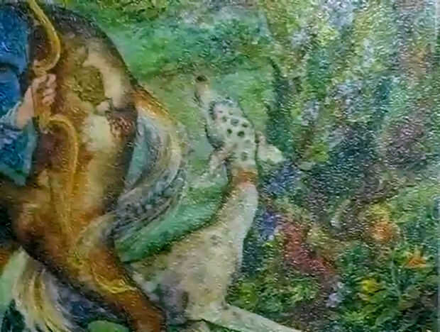El más importante y la parte más difícil de la obra por el acrílico de colores que en el primer color (me refiero a color blanco aquí en esta parte), la humedad de bajo color causa estas condiciones. Trabajo el color naranja en la nariz del animal y el color violeta que son como manchas en el cuerpo animal y de la oscuridad debajo de oreja, oreja y otras partes. (Figura 7)