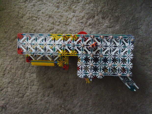 sigo trabajando en esto, pero aquí es la última.Cómo funciona esta versión;Este rifle es alimentado por un elástico grande que arranca en un carrete de mano. Los diferentes mecanismos están vinculados entre sí por los engranajes. La sección bloqueo d