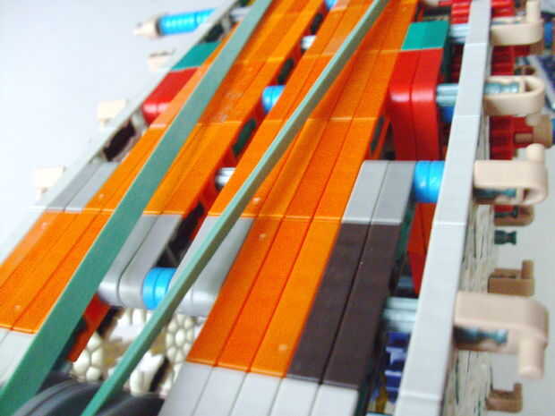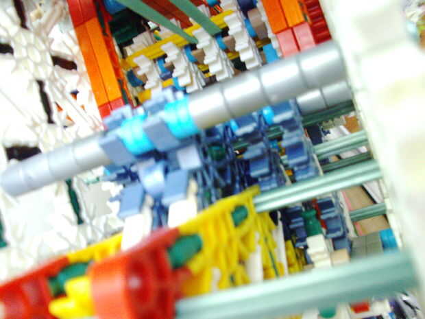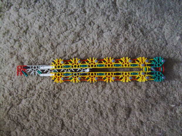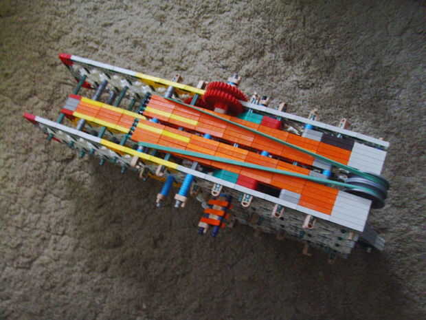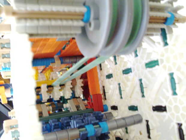 sigo trabajando en esto, pero aquí es la última.Cómo funciona esta versión;Este rifle es alimentado por un elástico grande que arranca en un carrete de mano. Los diferentes mecanismos están vinculados entre sí por los engranajes. La sección bloqueo d