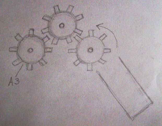 Esta imagen muestra la empuñadura, gatillo y una sección de las mecánicas de disparo El gatillo tira la corona alrededor en un círculo, siempre en movimiento en la misma dirección. El movimiento se transfiere desde la corona a la derecha a la corona a la izquierda (A3).