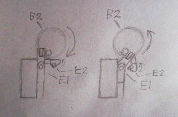 Estos son cerca ups de E1 de la última imagen. La imagen a la izquierda muestra el bloque de detener la rotación de la bobina (la bobina se denomina B2). La imagen de la derecha muestra el bloque de ser empujado fuera del camino mientras el carrete de la bobina con la manivela. E2 es empujado hacia adelante por un elástico para que el bloque puede reiniciar y será capaz de bloquear otra vez tan pronto como el operador detenga la bobina.