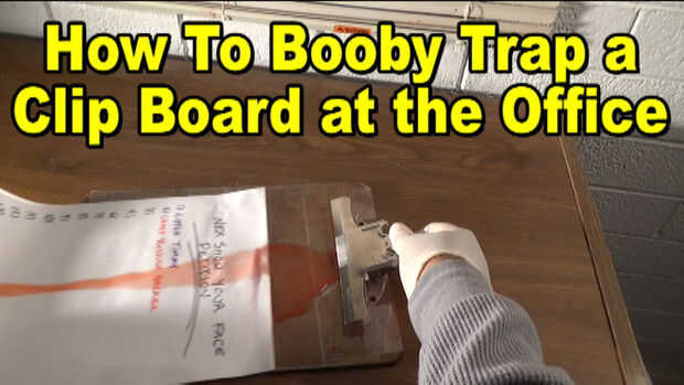 ¿Quien dice trabajo o escuela tiene que ser aburridas? Siempre hay formas de divertirse, por ejemplo, aquí es una poco trampa que puede configurar en su compañeros de clase o compañeros de trabajo. Se trata de un tablero de clip con documentos importantes y un globo de agua.