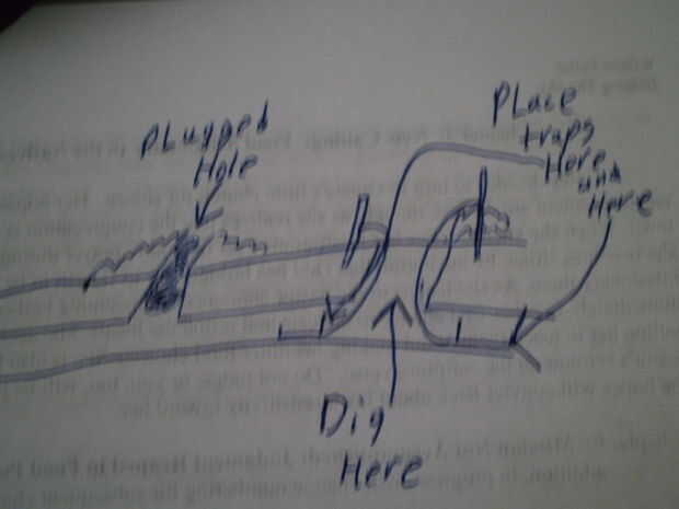 Una vez te has sentido la dirección general de las trampas, sobre un pie y medio desde el montículo y cavar un agujero que cruza el túnel que has sentido antes. Coloque las trampas hacia cualquier dirección en este túnel, como se muestra en el dibujo crudo pero efectivo. Coloque un pedazo de madera contrachapada o una gran roca sobre la apertura que acaba de hacer y sellar los bordes con tierra. (Topos odian luz).