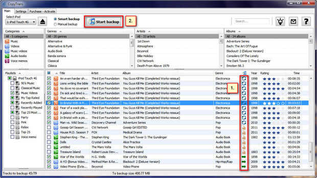 Por lo tanto CopyTrans no dejo pistas duplicadas una vez que haces a la transferencia. Después de tener un vistazo de lo que necesitan transferir pistas, simplemente haga clic en el botón de copia de seguridad de inicio.
