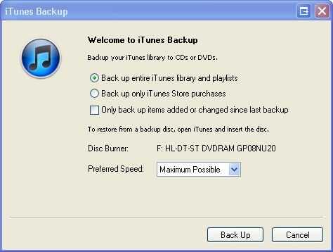 iTunes comenzará la copia de seguridad y pedirle de vez en cuando para cambiar el CD/DVD. La copia de seguridad de mi biblioteca de iTunes (18 GB) me tomó 5 DVD y 2 horas para terminar. iTunes me pidió cada 20 minutos para insertar un nuevo DVD y por lo tanto tenía que estar cerca de la computadora. Sin embargo funcionó bien y pude restaurar mi biblioteca en mi nuevo portátil.