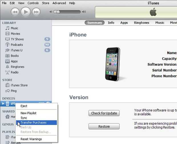 5) haga clic en el iPod/iPhone (usando el botón derecho del ratón) y seleccione "Transferir compras".