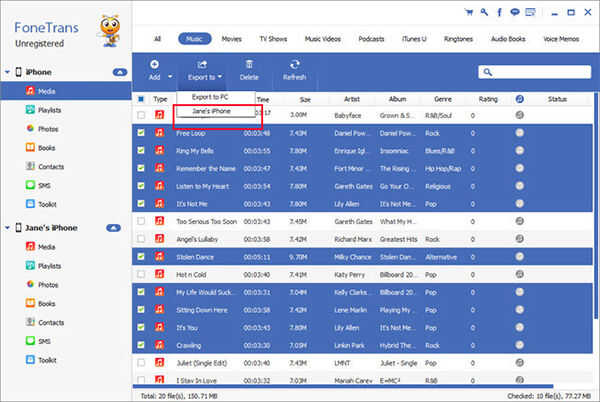 iPhone software de transferencia puede no sólo transferir musica del iPhone al iPhone, sino también transferir contactos, fotos, videos, películas, lista de reproducción, mensajes y otros archivos de iPhone a iPhone y entre computadoras y dispositivos iOS diferentes.