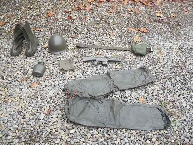 El primer paso es reunir todos los componentes asociados con el traje.  Mucho del traje se puede encontrar en su local Store.I de excedentes del ejército fue capaz de encontrar casco, cinturón, granadas, cargadores de lluvia, pintura de cara, cantina y titular de cantina mi tienda de excedentes del ejército.  El arma fue comprado en una tienda de Halloween y los pantalones y chaqueta se encontraron en una tienda de buena voluntad.  Al escoger los pantalones y la chaqueta es importante elegir un material adecuado.  Ciertos materiales se parecen más a plástico cuando pintadas que otras.  Trate de escoger un material de nylon como las utilizadas en tren en lugar de sudor pantalones material.  Un traje de lluvia también funcionaría bien.