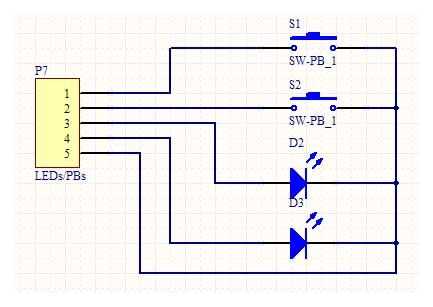 Botones y LEDs conectados al puerto digital de microcontrolador y pueden ser controlados de forma independiente.