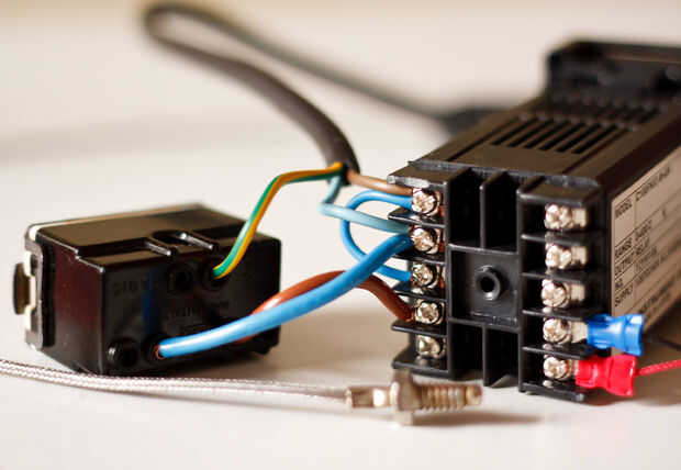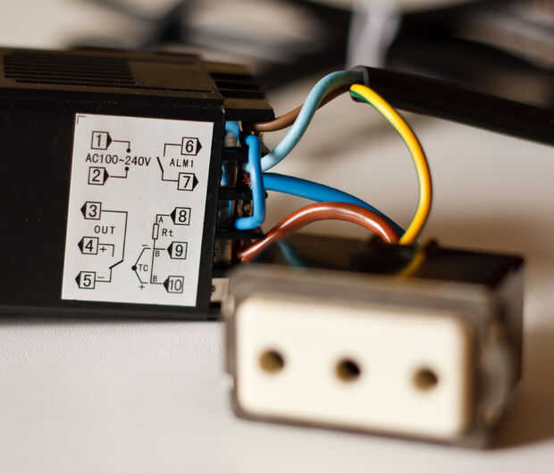 Aquí se puede ver el diagrama de las conexiones en la parte posterior del controlador. Este modelo funciona con AC 100-240V, pero usted puede encontrar controladores alimentados con tensiones diferentes. Tienes que atornillar los cables a los pines 1 y 2. Uno de estos cables de mismo debe ser conectada con una de las patillas del relé (yo usé el número 3). Uno de los pasadores de transmisión siguen tiene que conectarse con el enchufe hembra. El pin 5 es NC (normalmente cerrado) y el 4 es NO (normalmente abierto), conecte al pin 4, así que necesitarás cambiar ningún parámetro en la configuración del regulador.