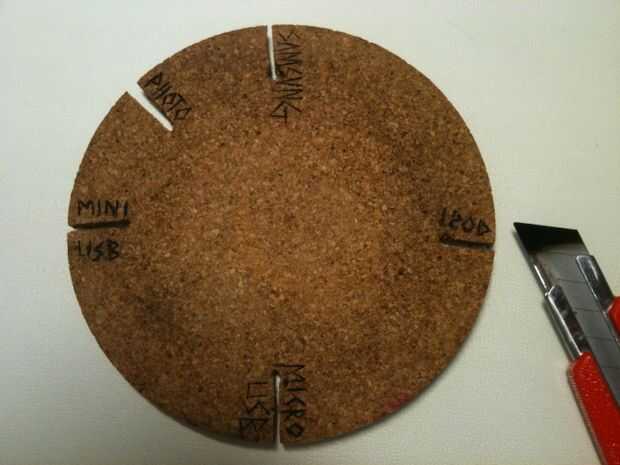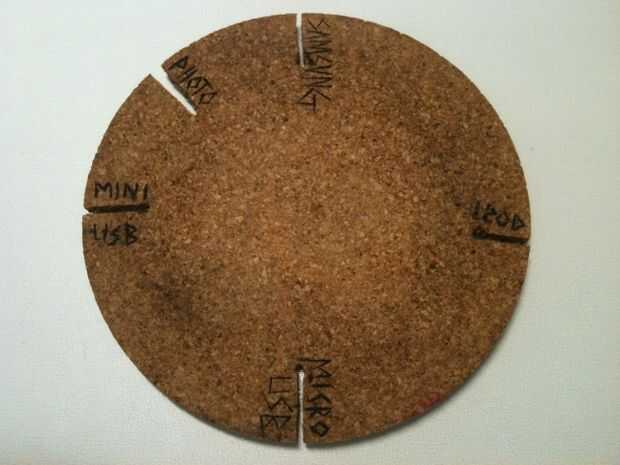 Entonces tomé el soporte de olla que estaba en mi cocina. Usted puede encontrar en IKEA también, pero son más grandes que los míos y usted debe cortar periférico 1-1.5 cm (estimación aproximada) para disminuir el diámetro de 2-3 cm y ajuste mejor. Tenga en cuenta que debe ser un poco más grande que el cuello del Jarrón para que no caigan en su interior, y lo suficientemente gruesa para mantener el peso de los dispositivos va a carga (mayor que 0.5 cm es suficiente). Con el cuchillo corté 2cm de largo y pocos milímetros de ancho (según el grosor del cable cada vez) pedazos de corcho y ensanchado en el extremo interior un poco, para que el cable puede ir para arriba y abajo libremente.