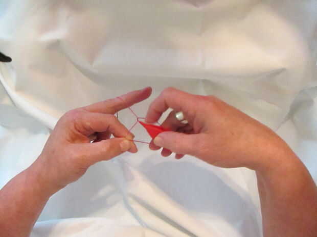 Presione el extremo de la lanzadera a través del agujero del triángulo.  Suelte el hilo por el meñique.