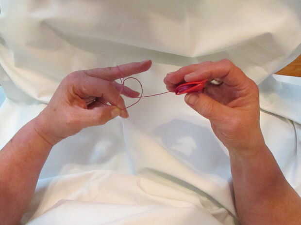 Ver el lazo en la parte de transporte del hilo?  Descansar el dedo medio de mano izquierda y tire del hilo con la lanzadera.