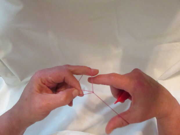 Ahora enderezar el dedo medio izquierdo y uso su dedo derecho del índice y pulgar para deslizar la primera mitad de la ds por el hilo en los dedos pellizcados.  Te darás cuenta que el hilo del anillo es más estricto al crear puntos de sutura.  Para aflojar el círculo, tire del hilo por debajo del sujetador en la mano izquierda.  Relájese o rebobinar el hilo de lanzadera según sea necesario.