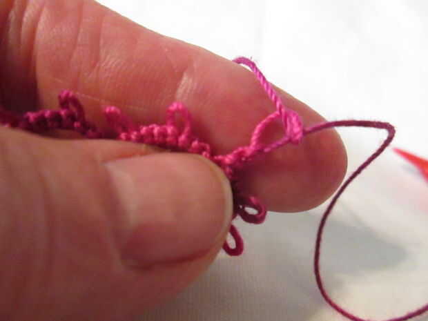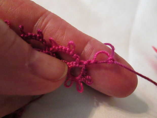 "-" o p = puntilla: un picot se crea cuando se deja una longitud del hilo entre dos ds.  Así que para hacer un picot, crear en ds, luego hizo otra ds con aproximadamente 1/4 pulgada de hilo entre los puntos dobles. (Estoy realmente tentado a tener una línea de 1/4 pulgada de largo tatuada en mi dedo índice izquierdo.  Ayudaría a mi picots concordar más en longitud.) Cuando Junte las 2 ds el hilo extra forma un bucle que es la puntilla.  Picots son importantes para conectar una ronda o adorno de encaje a la siguiente ronda o adorno.