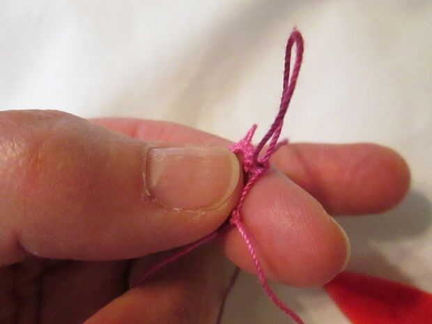 Usar la punta de la lanzadera (o pequeña ganchillo) para sacar el hilo por el picot.