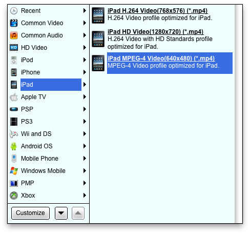 Elija "iPad" en la categoría de "Perfil" lista desplegable y luego seleccione "iPad Video (*.mp4)" como formato de salida de la subcategoría.