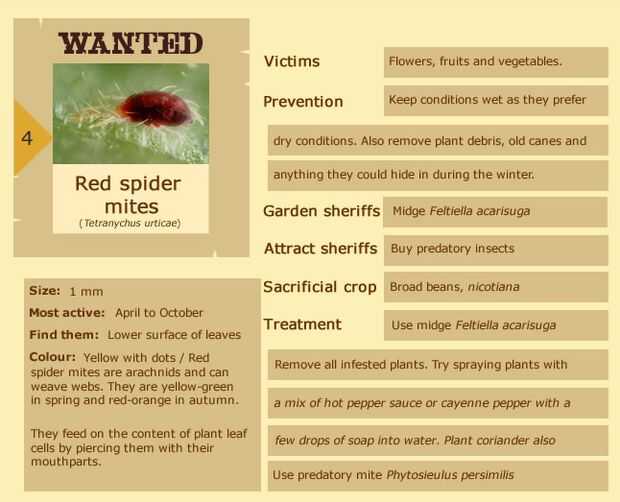 Araña roja - yo no soy un fan, muerden... y me refiero a la mordedura. Estaba sentado en mi jardín y miró hacia abajo para ver un pequeño ácaro rojo arrastrándose sobre mi mano, sonrió y fue casi el colocarlo delicadamente abajo en el pasto cuando llamarada de dolor corría por mi mano y ¡ Ay!, me mordió... tan tan pequeño no podía creerlo. La guerra fue el jajaja. Estas pequeñas bestias atacaron mi arbolito de manzana y busqué un aerosol que podía usar, me decidí por un spray de pimienta caliente mezclado con agua y una gota de jabón, tomaron unas semanas para deshacerse de ellos totalmente pero funcionaba y estaba seguro otra vez.