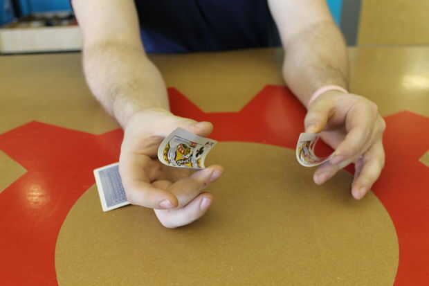 Antes de empezar el tratamiento, usted debe doblar ligeramente las tarjetas a lo largo de su eje vertical.  No demasiado pero lo suficiente como para pondrán de pie fuera de la mesa lo suficiente agarrar fácilmente.