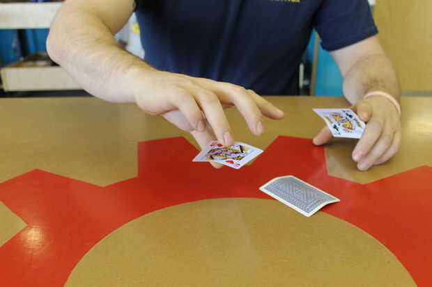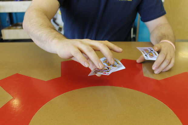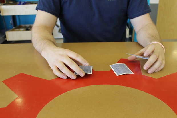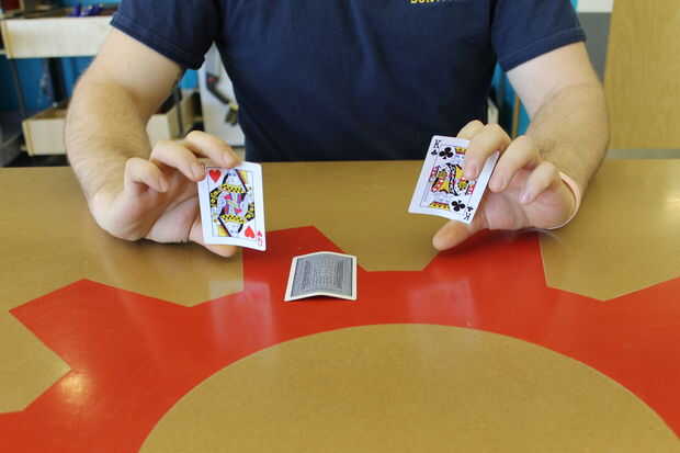 La clave en este punto es información. Recoger a la reina como antes pero esta vez tiro al rey en su lugar.  Se necesita habilidad un poco a la tarjeta superior pero nada no pueden averiguar varios intentos.  Si lo has hecho bien, los ojos de los jugadores seguirán naturalmente la tarjeta incorrecta.