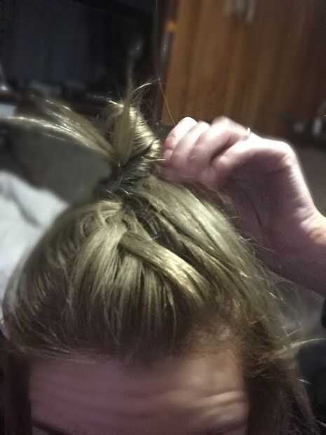 Recorren los dedos de longitud de cola de caballo y de la colmena/tease lo por lo que tiene volumen. Luego envolver el cabello alrededor del lazo del pelo y seguro.
