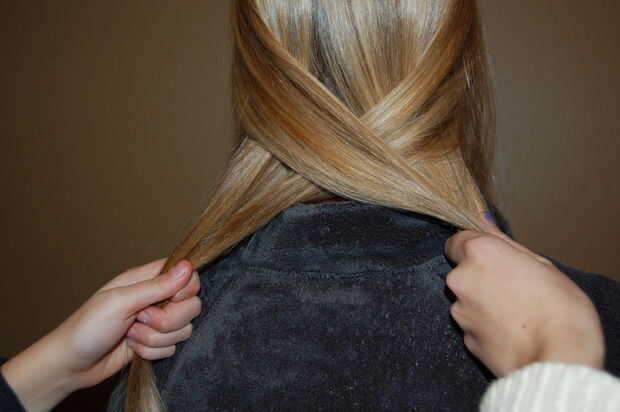 Haz un pequeño trozo de pelo del lado izquierdo y cruzar a la derecha. Hacer lo que hizo en el paso 3, pero invertida.