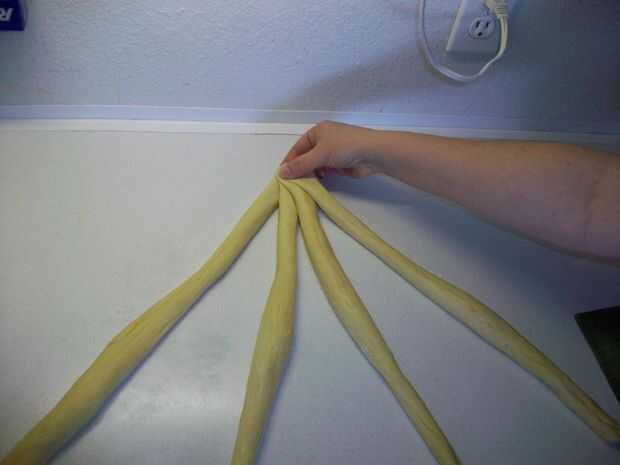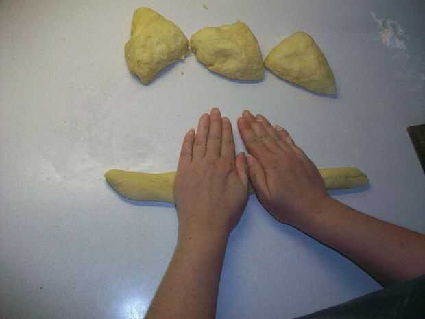 Estirar la masa en forma de cuerdas de igual tamaño. Encontrar la manera más fácil de hacer incluso todas las cuerdas que es la manera a través de rodillo desde el centro de la cuerda y presione y mueva las manos hacia fuera como usted.