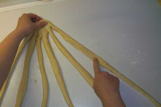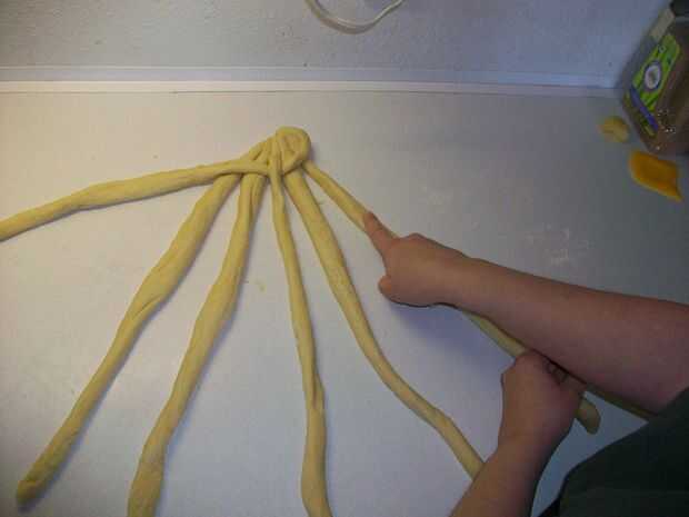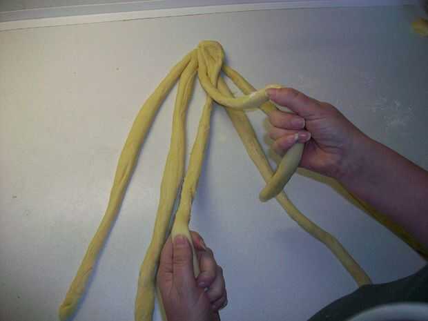 Como paso 1, método 1, dividir la masa en la mitad y divida cada mitad en tres partes. Otra vez como paso 1, método 1, rodillo cada porción de masa en una cuerda larga, colocar las cuerdas, pellizque los extremos juntos en la parte superior y apriete.