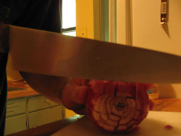 Mantiene juntos la cebolla, coloque sobre su lado y con cuidado cortar hacia abajo. Al llegar cerca de las raíces, puede poner cara de corte hacia abajo y corte alrededor de las raíces con la cebolla entera.