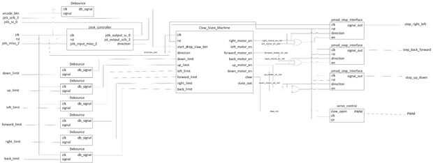Tan importante como es también es importante poder interactuar con todas las partes. Por ejemplo requiere la interfaz de motor de paso a paso que convierte la señal de una dirección, a las 4 señales de motor paso a paso necesario para ellos y el controlador de servos que cambia la garra abierta / cercana señal PWM de salida del servo, y el controlador de joystick, que toma los datos de la palanca de mando y la convierte en una dirección. También hay un módulo debouncing que toma la señal de los botones y los interruptores de límite y asegura que una señal estable se envía a la máquina de estado.