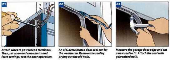 Antes de salir de su puerta de garaje por otra temporada, Compruebe la hermeticidad en el borde de la puerta. Si está deteriorado, use una palanca para quitar todos los clavos viejos (Fig. 22). Luego, use clavos galvanizados para asegurar un nuevo sello (Fig. 23). Finalmente, limpie las pistas de puerta y lubricar todos los rodillos de metal.