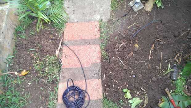 Desde aquí el tubo estaba cubierto sólo lo suficiente para ser estabilizado y luego el cable se alimentaba de un lado a otro hasta la longitud deseada. Ahora lo único que queda es rellenar los agujeros y cortar el cable sobrante. Lo que me gusta hacer es presionar suavemente en el suelo que se utilizó para llenar los agujeros con el fin de compactarla mejor y luego añadir más hasta que llena el espacio y finalmente el agua el suelo a cada lado cada día hasta que el suelo es colocado.