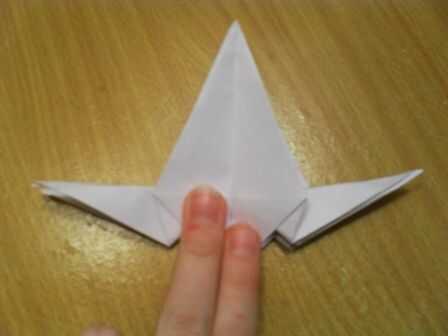 Debería ver cuatro piernas en la parte inferior. Doblar cada pierna hasta la mitad, lo que le permite girar interior que se ve como una montaña desde el lado. Es más fácil cuando están empezando a doblar para arriba tirando de él suavemente hacia los lados y hacia arriba, luego lo tira hacia abajo. Aplanarlo. Esto es similar a hacer la cola y el cuello a una grulla de papel.