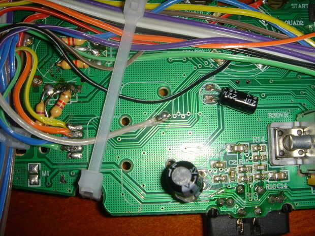 El siguiente es el lugar para el gatillo izquierdo. En lugar de intentar utilizar el potenciómetro de cobre cojines el ahora retirado utilizado, utilizaremos un punto de prueba frente al que está conectado a él. Usted encontrará este punto en donde estaba la Junta en forma de plus de Dpad. Encuentra el cable de RA0/Extra0, nuestro alambre 'cuarto punch', recortar a la longitud y cúbralo de estaño. Esta es la primera tecla que hemos soldado al ya no se soldar y no un por-agujero, por lo que debemos preparar la almohadilla por estañado demasiado.