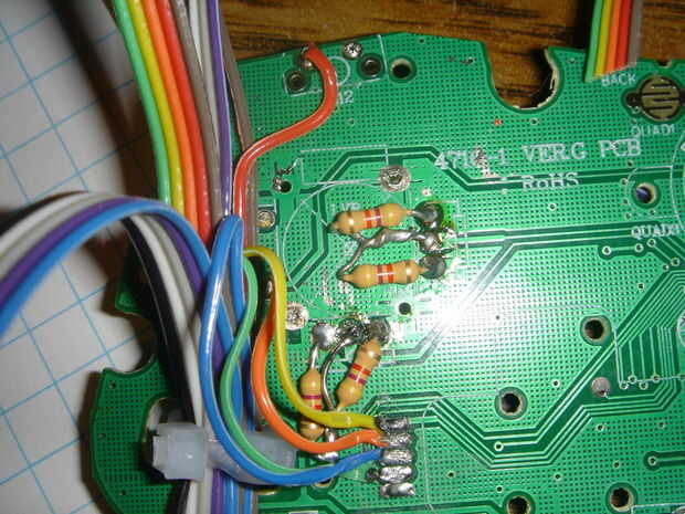 Después de la Dpad, el punto más a la izquierda es la izquierda parachoques, LB. Nos va conectando este al botón feroz, hasta localizar el cable para feroz, separar del lote de y corte a la longitud. Estaño el alambre puesto a través del orificio en que el interruptor LB fue y de la soldadura de la parte trasera.