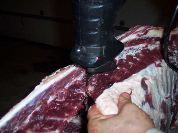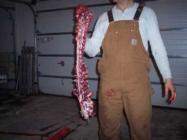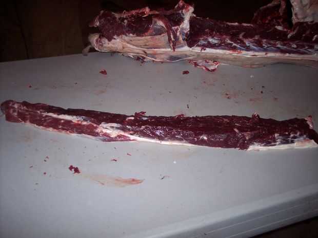 Tomar su sierra eléctrica y cortar las costillas de la columna vertebral. Ahora todo lo que queda es retirar los solomillos. Estas son las tiras gruesas agradables que van desde la cabeza hasta las caderas a lo largo de ambos lados de la columna vertebral. Llevarlos hacia fuera en una sola pieza y se hacen deliciosos asados de lomo. Si lo prefiere, puede cortar para obtener el cordero equivalente de filete mignon. Puede cortar los asados de la pierna en filetes de solomillo, si quieres. Me gustan mejor como asados.