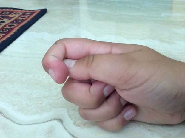 Ahora doblar el dedo medio y poner el dedo encima de la uña de su mudo