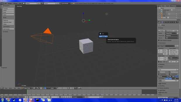 Haga clic en la cámara y luego mantenga pulsada la tecla Mayús mientras haga clic en la lámpara en la escena que puedes ver después de abrir Blender, golpe a X y luego haga clic en eliminar. Estos son elementos innecesarios para conseguir el cubo de textura.