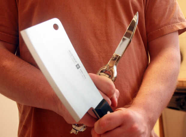 Butterflying a Turquía tiene algunas herramientas afiladas y un montón de energía. Así que coge tu mejor unas tijeras de cocina, cuchillas o cuchillos y vamos a empezar.