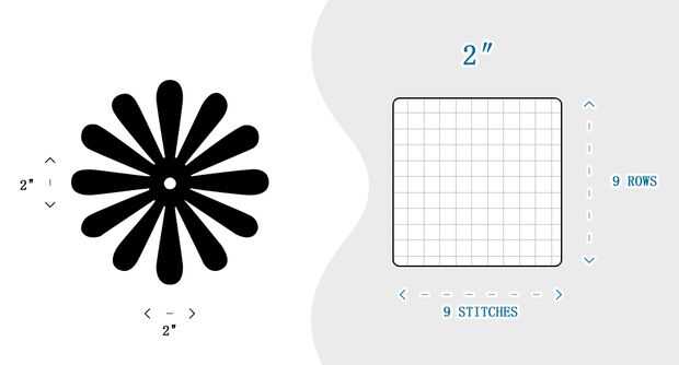 La flor que vio al principio de este tutorial es largo de 2'' y 2'' de ancho. Si quieres hacer uno con el mismo tamaño y no está seguro sobre qué tipo de hilo y el gancho puede usar, trabajar un cuadrado de 2 pulgadas con Ganchillo solo, y si al final tiene 9 filas con 9 puntos, a continuación, utiliza el hilo de derecha y gancho.