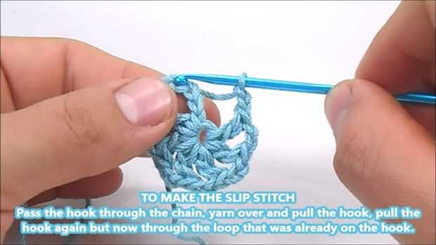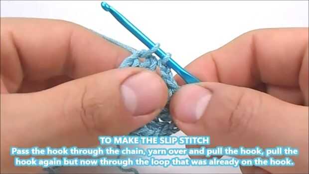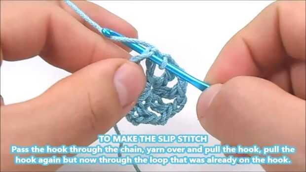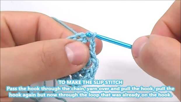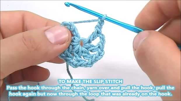 Para terminar la primera ronda, trabajar una puntada de slip en la cuarta cadena que trabajamos al principio de ella.