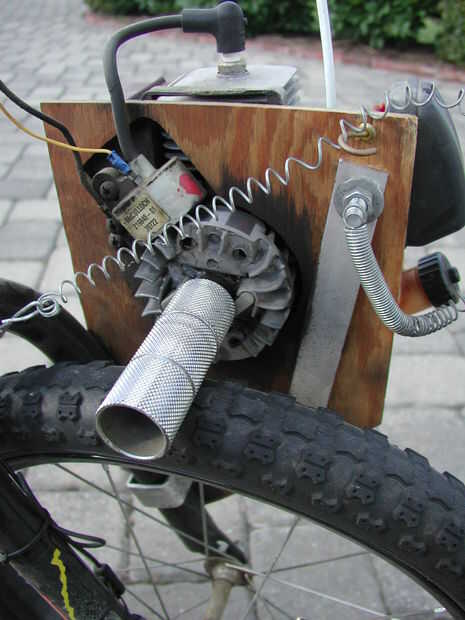 En este punto, tomé la bicicleta en su primer ensayo, que no duró mucho tiempo en absoluto. En realidad, más exactamente, nunca empezó. La placa de 1/4 de pulgada tiende a doblar en lugar de participar de la rueda. No podía obtener suficiente tracción para patear sobre el motor. Por lo tanto, por qué más gruesa madera contrachapada de 1/2 pulgada o mejor 3/4 pulgada, sería mucho más eficaz. Para detener la madera contrachapada de doblar sin empezar, he utilizado más para fleje de aluminio atornillada a la cara de la madera contrachapada. Sorprendentemente, esto funcionó! Con un furioso pedaleo pateó la moto encima y el motor comenzado, me ataques con cohetes hasta el final de mi calle. Esto fue muy sorprendente y muy emocionante para mí ya que la mayoría de mi mal pensamiento hacia fuera, frustración intentos segundo montados tienden a no trabajar.
