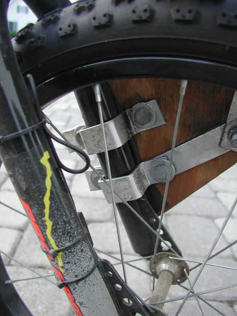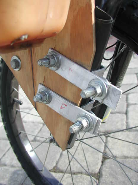 Con el motor firmemente atornillado a la madera contrachapada, seguí haciendo los soportes para conectar la madera contrachapada a la horquilla delantera de la bicicleta. Estos soportes perno alrededor de la horquilla delantera, a través de la madera contrachapada y un juego de planos soportes con los pernos de 5/16 de pulgada. Los soportes son capaces de apretar en la horquilla, así que hay suficiente tensión para sujetar el eje a la rueda.