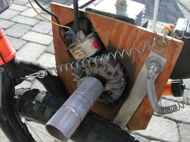 Era capaz de conducir la moto en este punto, pero no llego muy lejos: después de algunas millas de alta velocidad de golpes y vibraciones, los soportes de motor aflojaron para arriba. Después de un poco de tiempo pensando soluciones, terminé comprando un resorte de una tienda local hard ware. Aparejó un gancho de alambre a un agujero en la horquilla de la bicicleta y un gancho de latón en el extremo de la placa de madera contrachapada entre que el resorte puede ser tensado. El resorte permite cambios y el movimiento del motor manteniendo un montón de tracción entre la rueda y el motor.
