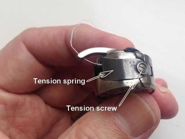 Es importante comprobar la tensión de la bobina como obtendrá pobres resultados y posiblemente hilo roto o trabado si es malo. Adaptarse a una bobina de hilo de la canilla y enrósquelo en el resorte de tensión. Suspender por el hilo. La tensión es correcta si es apenas suficiente soportar el peso de la bobina y la caja. Sacudiéndolo suavemente debe relajarse un poco más de hilo. Ajustar con el tornillo en el resorte de tensión. Si tienes cualquier dificultad, asegurarse de que no hay ninguna pelusa o pedazos de hilo de rosca quebrado bajo el resorte de tensión.
